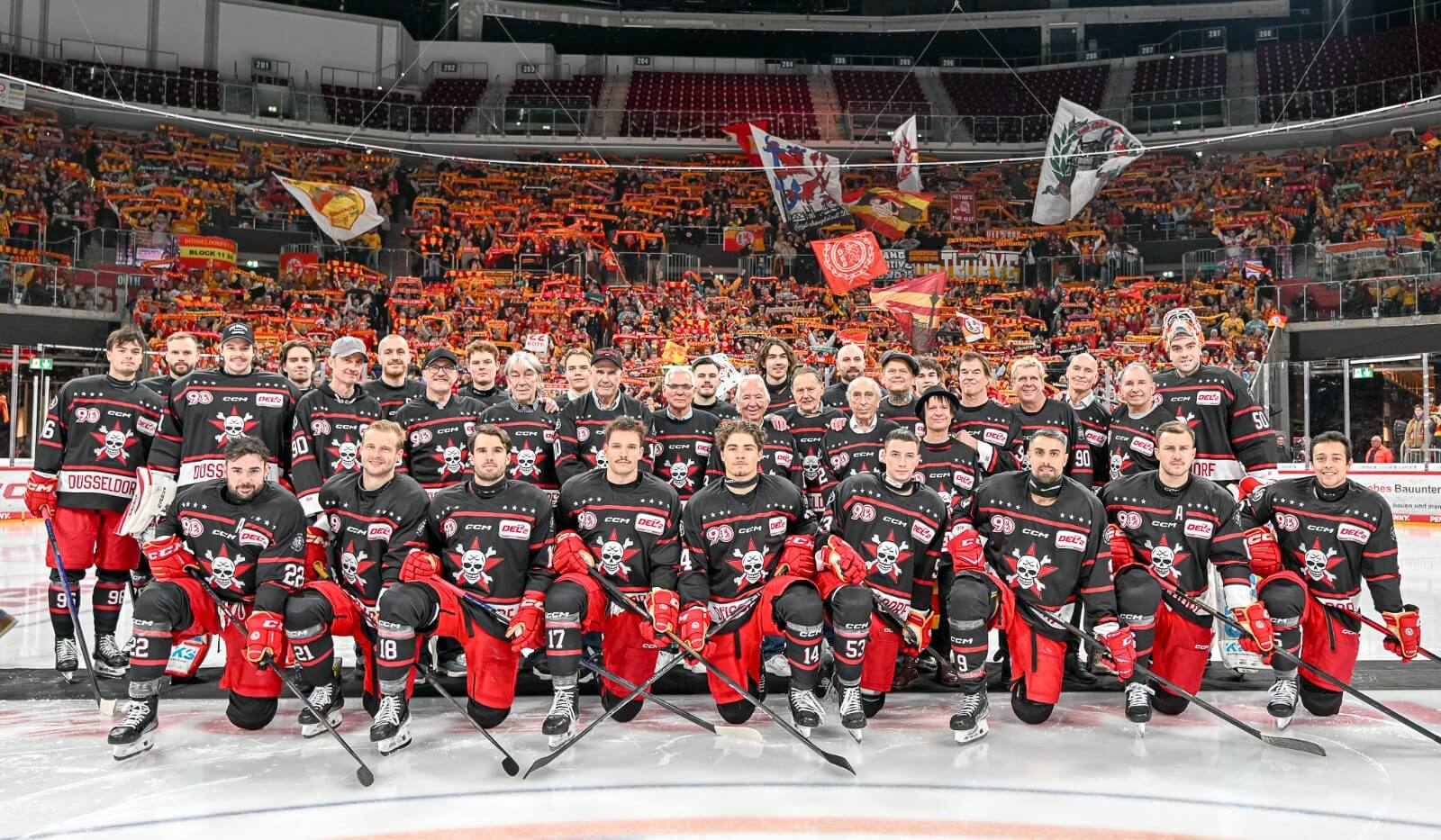 Beim heutigen Spieltag gegen die Starbulls Rosenheim stand weit mehr als „nur“ Eishockey auf dem Programm. Denn: vor 90 Jahren schlüpfte unsere DEG aus dem rot-gelben Ei – am 8. November 1935 genau gesagt. Da das kommende Wochenende spielfrei ist, wurde das große Jubiläum bereits heute gefeiert. Zur Feier des Tages lief die Mannschaft mit einem Sondertrikot auf, das in Zusammenarbeit mit den Toten Hosen entwickelt wurde. Alle fünf Bandmitglieder Campino, Kuddel, Breiti, Andi und Vom präsentierten das schöne Stück Stoff persönlich vor dem Spiel. Dazu waren zahlreiche Ehrengäste aus neun Jahrzehnten Clubgeschichte im PSD BANK DOME zu Gast. Vor dem ersten Bully sorgte eine feierliche Zeremonie für Gänsehaut, als die DEG-Legenden Otto Schneitberger, Petr Hejma, Walter Köberle, Peter John Lee, Chris Valentine und Daniel Kreutzer (der leider nicht anwesend sein konnte) begrüßt wurden – alle Spieler, deren Rückennummern nie wieder vergeben werden.