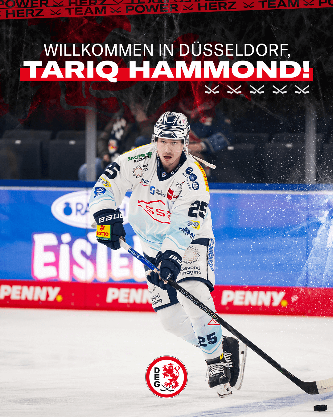 Die Düsseldorfer EG verstärkt sich für den Rest der Saison 2025/26 und arbeitet gleichzeitig schon am Team der Spielzeit 2026/27. Von den Dresdner Eislöwen wechselt mit sofortiger Wirkung Verteidiger Tariq Hammond an den Rhein. Der großgewachsene Deutsch-Kanadier konnte 2024 mit den Eisbären Regensburg und 2025 mit Dresden die DEL2-Meisterschaft gewinnen und war stets eine verlässliche Stütze dieser Teams. Der 32-Jährige Linksschütze hat einen Vertrag bis Sommer 2027 unterschrieben und ist schon am Wochenende spielberechtigt.